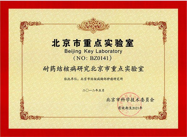 耐药结核病研究北京市重点实验室是2012年5月经北京市科委认定成立的北京市重点实验室,依托单位为北京市结核病胸部肿瘤研究所。