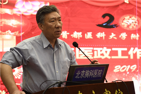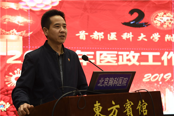 主管医疗工作副院长陈效友首先对医院2018年医政工作进行总结和回顾。2018年北京胸科医院各项医疗指标趋好发展,传统科室如结核内科、肿瘤内科、胸外科和骨科等充分发挥优势学科作用,在救治疑难重症患者方面发挥了巨大作用;新发展科室也有了长足的进步,心脏中心正式运营半年来,完成包括疑难复杂冠心病在内的介入治疗手术近300例,急性心梗绿色通道成功救治多例心梗患者;乳腺科的手术量同比增长近30%;中医科门诊量同比增长超过80%,新科室的发展不断完善了医院的学科结构。