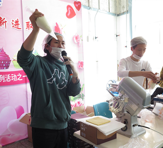 “咱们将打好的奶油,均匀挤在第一层蛋糕胚上。”来自贝思客蛋糕专业西点师一边演示一边教授大家蛋糕制作的技巧和知识。