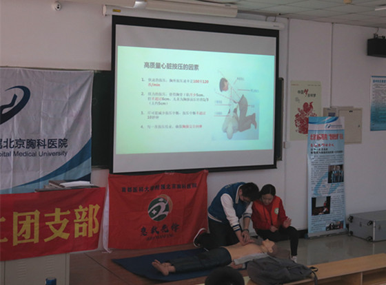 在庆祝中华人民共和国成立70周年、纪念五四运动100周年来临之际,为向公众普及救护知识,提高全民急救意识与现场急救能力,4月10日,北京胸科医院外科二团支部、重症医学科“急救先锋”小组走进北京工业大学通州校区,为在校大学生培训心肺复苏技能。