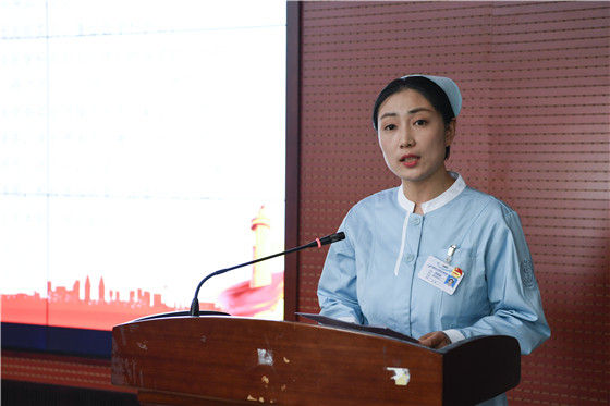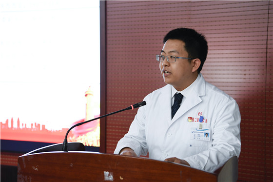 随后,来自医疗、护理、医技、科研、后勤、行政岗位的青年代表结合五四精神和本职工作进行交流,胸外二科苏崇玉不断学习新技术、将临床与科研紧密结合;重症医学科李新颖尽力维护一个个脆弱生命、无私传授急救技能、在付出中收获喜悦;医学影像科技师孙萌萌自主学习、不断提高技术水平、对工作满腔热忱;药物学研究室副研究员徐建“时不我待、只争朝夕”地做研究;财务处出纳朱勍“虽为后勤,事(誓)不落后”;人力资源处杨楠甘当绿叶配红花、如春雨般瑞物细无声。最后,他们共同向团员青年发出“融入新时代,奋斗新时代”的号召!