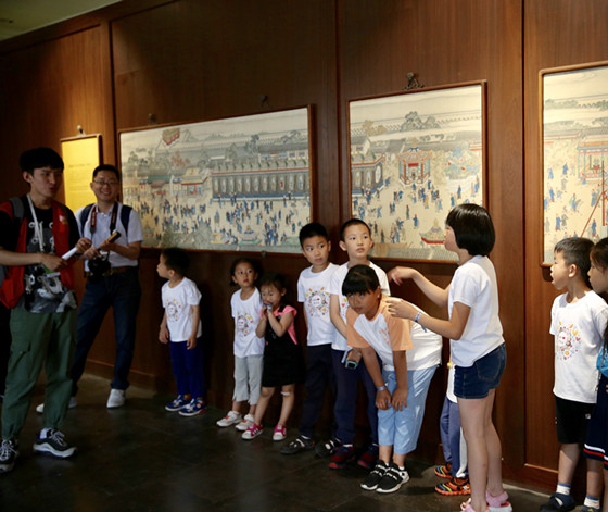 活动中,1名故宫儿童体验馆的老师带领5名故宫小讲解员,以孩子们的视角,沿着紫禁城的核心——中轴线,向参加活动的大朋友、小朋友们介绍了七座宫/殿(太和门、太和殿、中和殿、保和殿、乾清宫、交泰殿、坤宁宫)的功能、作用以及相关的故事。“太和门,是紫禁城内最大的宫门,也是外朝宫殿的正门……”小讲解员们准确、熟练的讲解,一板一眼,范正腔足,由于年龄相仿,表达相似易理解,参与活动的小朋友听的认真极了。随后,十组家庭一起参观《天子万年展》,了解一国之君的皇帝是怎样过生日的。
