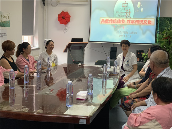 2019年9月12日,中秋节即将来临之际,综合科“胸心港湾”的医、护、患在十区会议室,举办了“共度传统佳节 共享传统文化”中秋座谈活动,一起度过了愉快的午间时光。