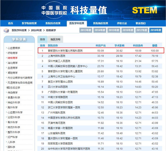 北京胸科医院连续四年获得“中国医院科技量值排行榜”结核病学榜首