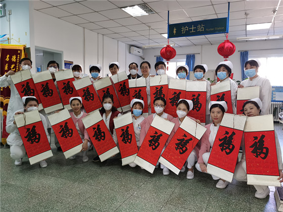2020年1月23日,鼠年春节来临之际,首都医科大学附属北京胸科医院肿瘤二科病房里充满了过年的喜庆气氛。上午,科室主任、护士长带领全体医护人员为每一位留在病房不能回家过年的患者送上了特殊的礼物——新春“福”字。这些“福”字是志愿者朋友特意为患者及值班的医护人员书写的。这是“天下第一福”,写法里暗含了“子、田、才、寿、福” 五种字形,寓意“多子、多田、多才、多寿、多福”,表达了我们所有医护人员对患者们的美好祝愿。