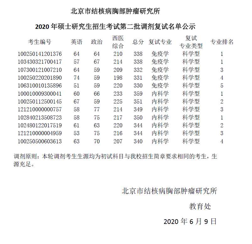 北京市结核病胸部肿瘤研究所2020年硕士研究生招生考试第二批调剂复试名单公示
