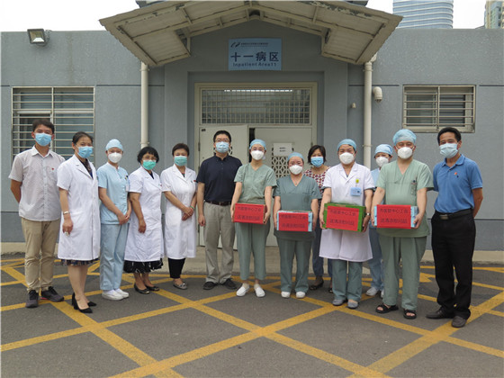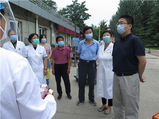 党委书记陈兴德、副书记李艳红,工会主席王丽娟一同参与慰问。一行人首先来到医院大门口,看望坚守岗位的疫情防控守护卫士,这些岗位的工作人员由服务公司职工和医院所有职能科室的干部、职工组成,他们从疫情初期一直坚守到现在,一丝不苟、兢兢业业,守护着医院的平安。申处长一边递送慰问物品一边叮嘱大家,千万要注意做好防护、不要中暑,鼓励大家再接再厉,坚守岗位,不放松、不麻痹,继续守好医院的第一道防线。