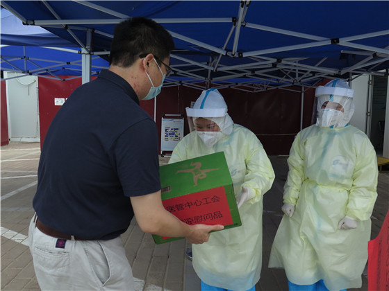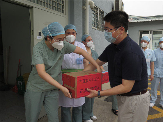 7月17日下午,入伏第二天,天气闷热,北京市医管中心财务资产处处长申轶,代表北京市医管中心来到北京胸科医院慰问医院职工。一行人来到医院大门口筛查处、咽拭子采集处、发热门诊等地,为疫情防控一线岗位的医务人员送来防暑慰问品,叮嘱大家在做好疫情防控工作的同时,也要关注自身的身体状况。