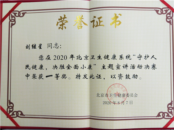 2020年8月7日下午,北京市卫生健康系统“守护人民健康,决胜全面小康”主题宣讲活动决赛在北京市卫生健康委党校举行。我院重症医学科护师刘继星,经过激烈的角逐脱颖而出,荣获比赛一等奖。