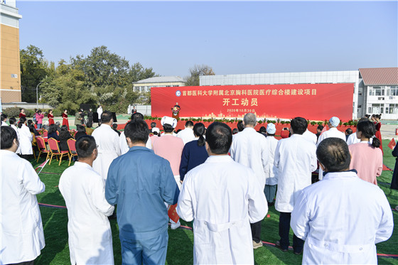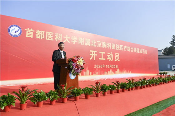 北京胸科医院院长许绍发在开工动员中回顾了北京胸科医院建院六十五年来的历史,他代表医院向关心支持医院发展建设的领导、专家、广大职工及社会各界表示感谢。他说,65年来,几代胸科人团结奋进、不忘初心、积极进取,在中国结核病及胸部疾病的医疗、教学、科研、预防、管理方面做出了突出的贡献。今天,北京胸科医院总体规划建设在北京市委、市政府及各级领导的支持和帮助下有序推进,医疗综合楼建设项目破土动工,在这个历史发展的关键时期,胸科人要更加团结一心,不忘初心,不负使命,从城市副中心辐射全国,为患者提供更高水平、更高质量的诊疗服务,向着“国内一流、国际知名”现代化胸科医院的目标奋勇前进。