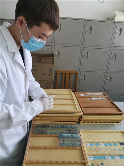 蜡块制作完毕,切片是重要的一个环节。切片的薄度可要比我们使用的A4纸薄太多了,要以微米计算,这可是眼明手巧的技术活。切片、摊片、裱片要一气呵成,再放进烤箱烘烤半小时。