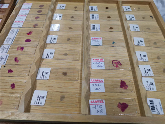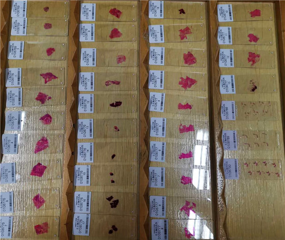 然后就要进入姹紫嫣红的染色环节了。经过十几缸的洗洗泡泡,出浴的“玻片”被披上了靓丽的彩妆。