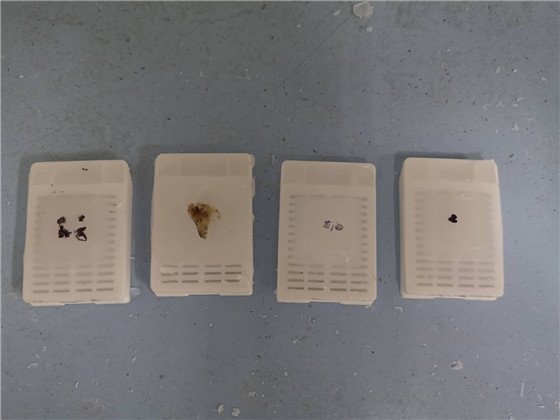 然后将处理好的标本块放入大大小小的模具盒,注入液体石蜡,经冷却台冷却就变成方方正正的蜡块了(即包埋),可以进行长期保存。