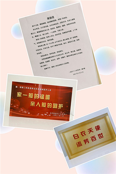 在为患者治疗及护理的过程中,结核二科医护人员一直将人文关怀贯彻在患者治疗的始终。虽然结核病是一种慢性病,需要长时间的治疗及护理,但是有了我们医护人员的陪伴,患者在治疗过程中不再孤单害怕,治疗及护理效果也得到了患者的充分肯定。患者在出院的时候纷纷写下感激的文字,这对我们医护人员来说也是一种激励,感谢患者的信任,我们将更加努力的提高自己,为患者提供更好的治疗及护理。