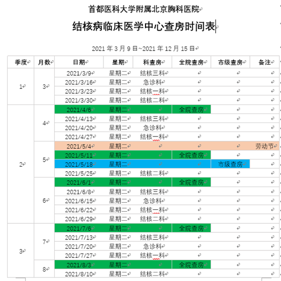 本着从有利于患者的诊疗、有利于学科的发展、有利于人才的培养出发,北京胸科医院结核病临床医学中心从2021年3月9日起,开展结核病大查房,每周有全结核科大查房,每月有全院大查房,每季度有全市大查房,具体安排如下,我们将在适当的时候进行全国远程直播,欢迎全国结核病防治战线同道们莅临指导。