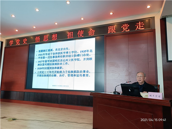 退休院外通州党支部端木宏谨同志以《岁月流逝 光辉永存》为题讲述了我院近代中国结核病防治事业奠基人何穆所长和裘祖源副所长战斗、工作的故事。他讲到:老一辈结核人始终不忘初心、秉承科学精神、实事求是地开创和发展了防痨事业。老一代共产党员对党的信仰和忠诚,对事业的坚守和执着,彰显了共产党员对人生的追求和奉献。他们给了我信仰的力量,并足以让我受益终生。