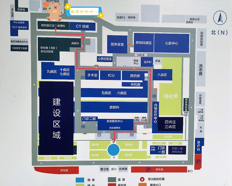 位于医院西北角,研究楼C区(灰色二层楼)1层,紧邻CT室。