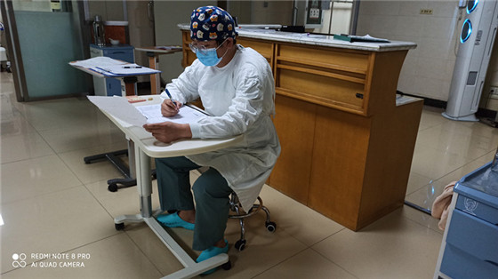 工作内容虽然与以往几近相同,但是在这身防护用具的包裹下一切行动就都变得尤为笨拙,甚至有些艰难。平日里测血糖是最简单不过的操作,但是当戴着三层手套去捏那片薄薄的血糖试纸时,这一个小小的动作要反复几次才能成功。上班当日我尽量少吃饭、少喝水,生怕任何情况发生,造成医疗资源的浪费。