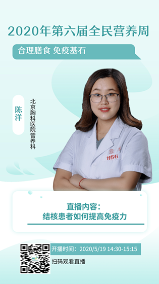 第一讲: 5月19日 (周二)下午14:30—15:15,陈洋医师主讲“结核患者如何提高免疫力?”,欢迎广大结核患者扫码观看和互动。