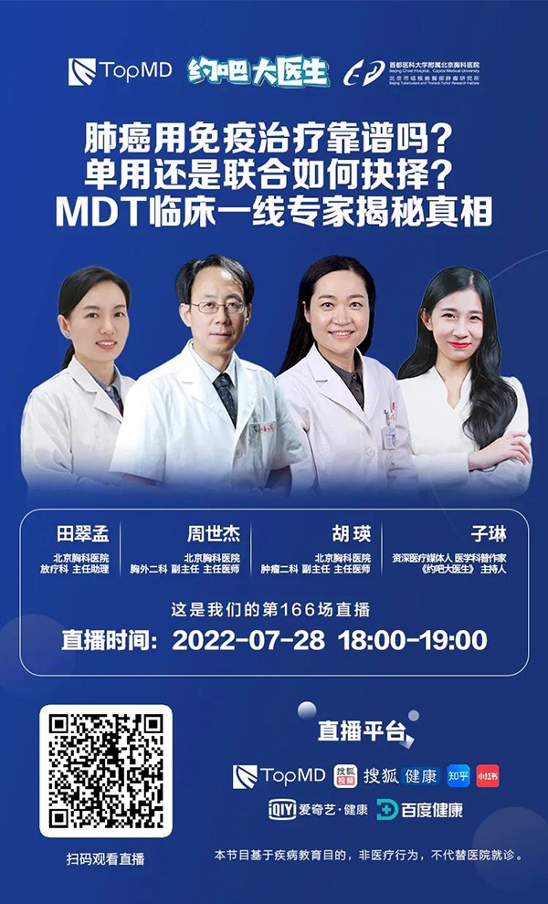 就在2022年7月28日(周四)18:00-19:00,特邀首都医科大学附属北京胸科医院胸外二科副主任、主任医师周世杰,首都医科大学附属北京胸科医院肿瘤二科副主任、主任医师胡瑛,首都医科大学附属北京胸科医院肿瘤内科放疗科主任助理田翠孟做客《约吧大医生》直播间,跟大家聊聊肺癌免疫治疗的热门问题。
