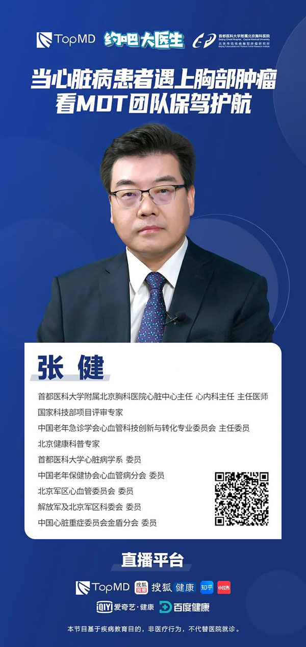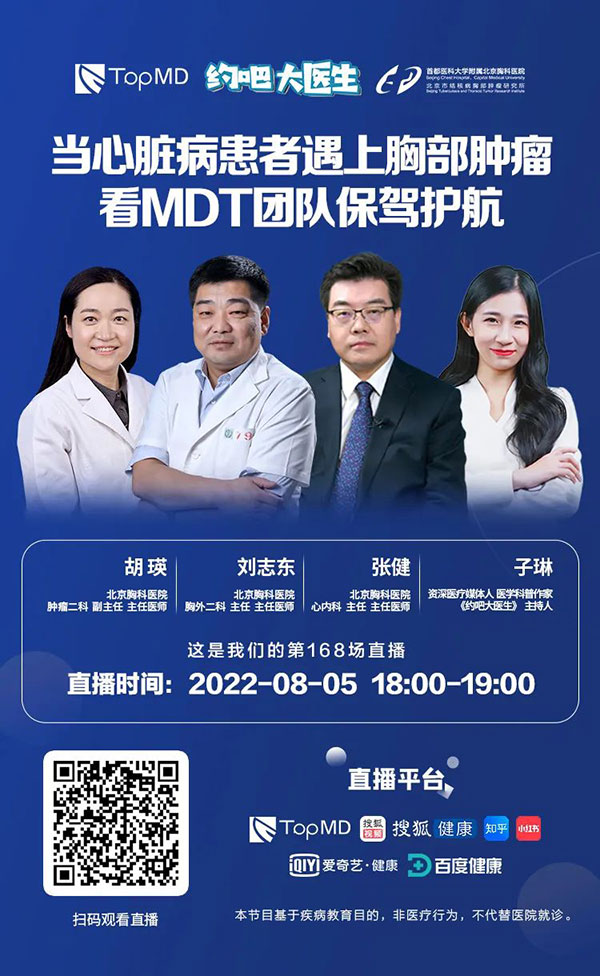 就在2022年8月5日(周五)18:00-19:00,特邀首都医科大学附属北京胸科医院胸外二科主任、主任医师刘志东,首都医科大学附属北京胸科医院心内科主任、主任医师张健,首都医科大学附属北京胸科医院肿瘤二科副主任、主任医师胡瑛,做客《约吧大医生》直播间,看看心脏病遭遇胸部肿瘤这样的棘手问题如何解决,三位专家即将与您分享化险为夷的成功案例。