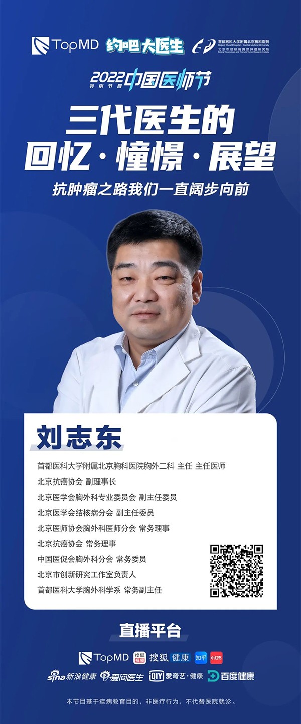 2022年8月19日(周五)18:00-19:00,在2022中国医师节这个特别的节日,《约吧大医生》栏目组特邀北京胸科医院“老中青”三代医生做客直播间,从三代人从医的难忘经历,看抗癌路上医生是如何帮助肿瘤患者度过难关的感人故事。让我们一起期待肿瘤内科主任医师张树才、胸外二科主任、主任医师刘志东、肿瘤内科医师魏嵩的精彩讲述!向医者致敬!