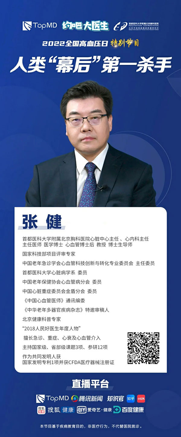就在2022年10月8日(周六)18:00-19:00,特邀首都医科大学附属北京胸科医院心脏中心主任、主任医师张健做客《约吧大医生》直播间,看看人类幕后第一杀手到底是什么?看高血压是如何摧毁我们身体健康的,我们又该如何对抗高血压?本期节目很多真实案例将与您分享。