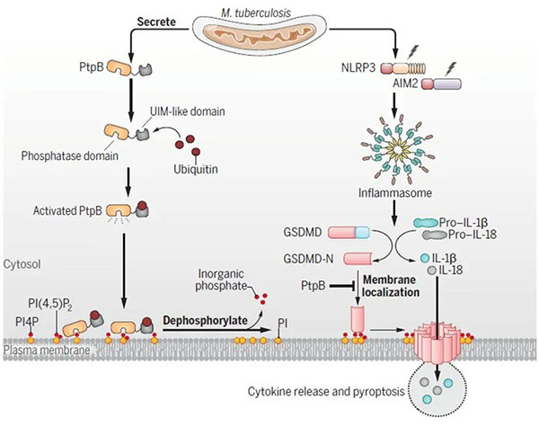 近日,北京胸科医院细菌免疫室作为合作单位,与中国科学院微生物研究所的刘翠华研究组等团队在国际权威期刊《Science》发表题为“A bacterial phospholipid phosphatase inhibits host pyroptosis by hijacking ubiquitin”的研究论文,揭示了结核分枝杆菌(M. tuberculosis,Mtb)利用脂磷酸酶PtpB挟持宿主泛素进而拮抗GSDMD介导的细胞焦亡的病原免疫逃逸新机制,刘翠华课题组的特别研究助理柴琪瑶、北京胸科医院细菌免疫室的博士研究生余珊珊以及刘翠华课题组的博士研究生钟延昭为该论文的并列第一作者,中国科学院微生物研究所的刘翠华研究员、汪静项目研究员和北京师范大学的邱小波教授为共同通讯作者。北京胸科医院细菌免疫室长期致力于结核菌的耐药机制及宿主抵抗结核菌感染的免疫机制等方面研究,具有丰富的临床资源,基础——临床联系紧密,并与中科院微生物所刘翠华研究组等团队保持密切的合作与交流,为抗结核治疗及药物研发提供了多种新思路和潜在新靶点。