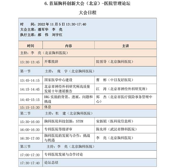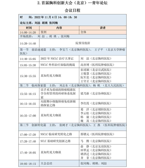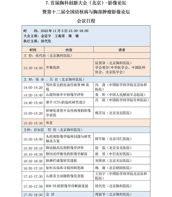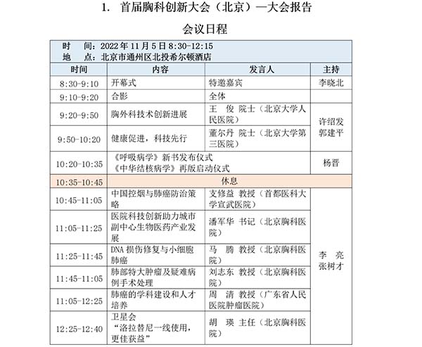 首都医科大学附属北京胸科医院/北京市结核病胸部肿瘤研究所(以下简称:院所)是一所成立于1955年、以胸部疾病为特色的三级甲等医院和研究机构,为进一步推动胸部疾病领域的学术交流和协同创新,提高胸部疾病诊疗水平,院所联合人民卫生出版社等单位定于2022年11月4日-8日在北京共同举办“首届胸科创新大会(北京)”,本次大会主题为“聚焦胸部疾病、推动协同创新”。为贯彻落实有关疫情防控要求,经大会组委会研究后决定,大会会议形式调整为:1.开幕式/大会报告为“线下直播间+线上直播”,不对外开放。2.大会分论坛均调整为“线上连线+直播”。会议内容不变,详情请见日程。