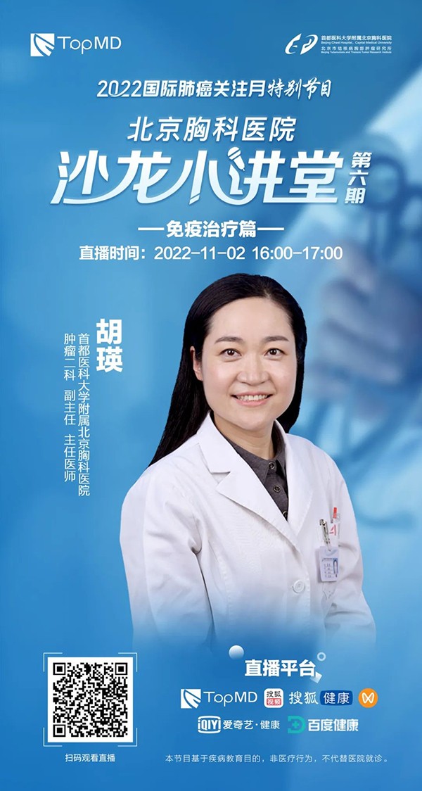 就在2022年11月2日(周三)16:00-17:00,特邀首都医科大学附属北京胸科医院肿瘤二科副主任、主任医师胡瑛做客TopMD直播间,给肺癌病友和病友家属们科普关于免疫治疗的机理、免疫治疗的应用、注意事项等各种大家关心的问题,都是病友们最想问的那些问题,欢迎转发节目预告给更多有需要的病友,届时欢迎扫描下方二维码观看直播!有问题请您在评论区留言与专家互动。