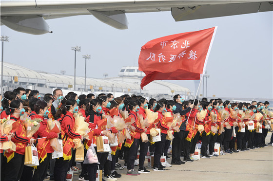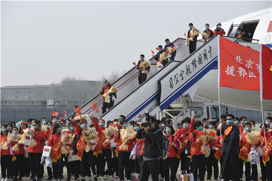 白衣执甲,英雄凯旋。3月31日下午,北京市支援湖北医疗队150人,包括138名医护人员和12名记者,历经65天鏖战,圆满完成支援武汉抗击新冠肺炎疫情任务,平安抵京。北京胸科医院10位队员谢忠尧、高建楠、张楠、史亮、彭乐、张俊、李佳航、张玉婷、刘继星、赵丽随队平安归来。