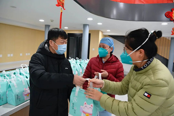 来自急诊科的高建楠护士长成为第一个领到餐食礼盒的职工,潘军华书记手持礼盒,面带笑容送出心意与祝福,“礼盒里面是咱们医院领导班子的心意,代表着我们对所有职工的感谢与敬意,希望你们能够开心的迎接新春。”接过饱含情谊的礼盒,感受到医院的祝福,高建楠激动的心情溢于言表,“医院食堂第一次搞小年送新春活动,我们非常激动,这是医院对我们全体一线医务工作者的关心与关爱,作为一名胸科人,我感到很幸福。”