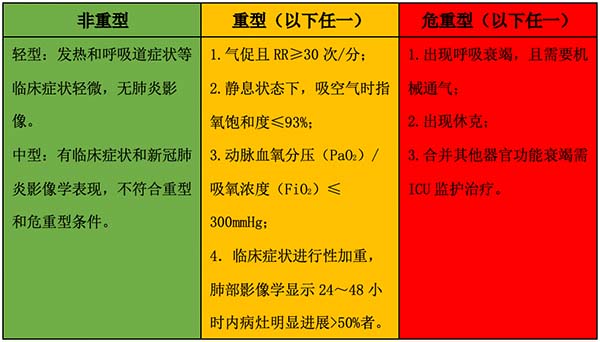 ①呼吸窘迫,低氧血症加重或吸氧需求持续增加;②组织氧合指标恶化或乳酸进行性升高;③外周血淋巴细胞计数进行性降低;④外周血炎性标记物如IL-6、CRP、铁蛋白等进行性升高;⑤D-二聚体等凝血功能相关指标明显升高;⑥胸部影像学显示肺部病变明显进展;⑦出现脏器功能受损(心肌酶、肝酶或肌酐水平升高)。