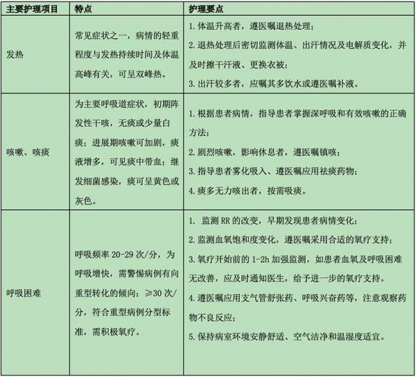 新型冠状病毒感染患者常常伴有高热以及严重的呼吸道症状,加之重型和危重型患者涉及氧疗、呼吸支持、俯卧位通气等医疗干预,其护理工作量大,并存在特殊性。现结合第十版诊疗方案和我们的经验提出以下护理规范以供参考:
