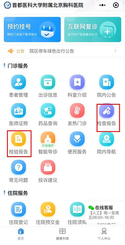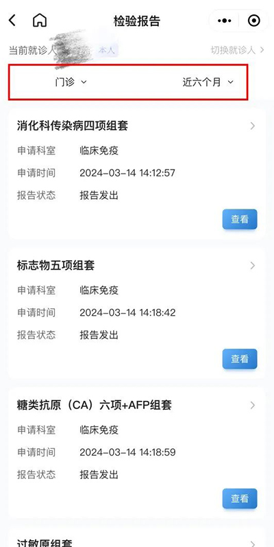 您可以在小程序首页点击【检查报告】或【检验报告】,进一步查询>>