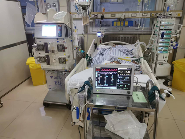 治疗3天后,患者的生命体征趋于平稳,但由于休克导致脏器缺血灌注不足,出现多器官功能衰竭,生化检查提示患者出现代谢性酸中毒、高钠血症、高氯血症、肝肾功能异常,且合并少尿。重症医学科认真分析病情后,再次召集医院胸外一科消化内科麻醉科、输血科等相关科室的多位专家进行联合会诊。大家一致认为目前为患者进行血液滤过(CRRT)是唯一有效的手段。在征得家属同意后,科室立即为患者行CRRT治疗,抢救生命。