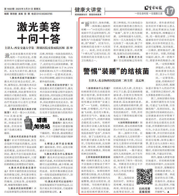 3月31日,生命时报刊发了北京胸科医院结核二科主任高孟秋的署名文章。