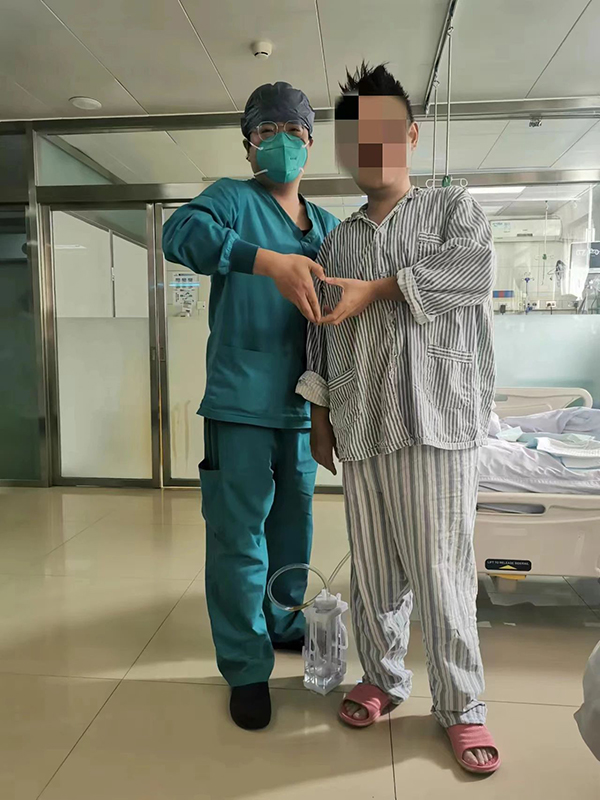 一天、两天、三天……在多科室医护团队的全力救治下,小杨的各项生命体征越来越平稳,熬了多日的医护人员终于放下心来。经过四天全力以赴的救治,小杨的各项指标终于恢复了正常,在他即将离开重症医学科的时候,特意走下床与多日来和他形影不离的医护人员合影留念,并表达着他最真诚的感谢。