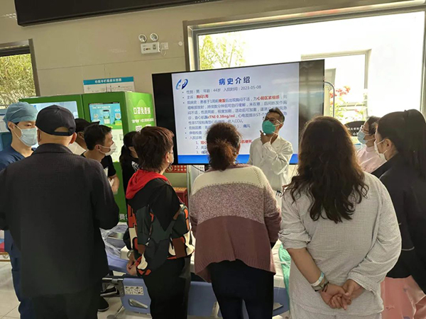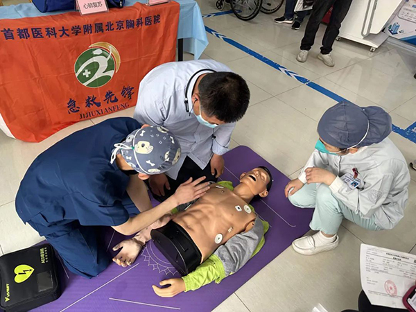 重症医学科设置的“心肺复苏及AED使用体验区”,由急救先锋小组成员现场演示,情景模拟,让患者及家属动手操作,亲身体验,掌握正确方法,学会急救技能,致力于让每一位目击者成为第一施救人,为他人增加一份生的希望。