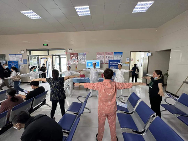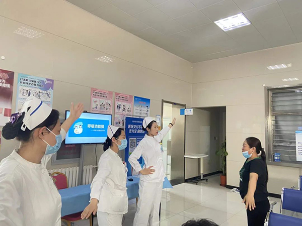 呼吸与危重症医学科团队护理人员带领患者及家属现场学习 “健康呼吸韵律操”,呼吸操可以增强呼吸肌力量、缓解呼吸肌疲劳、锻炼呼吸功能、提高呼吸耐力、改善生活质量。简单的动作,让患者及家属一起现场“洗个肺”。