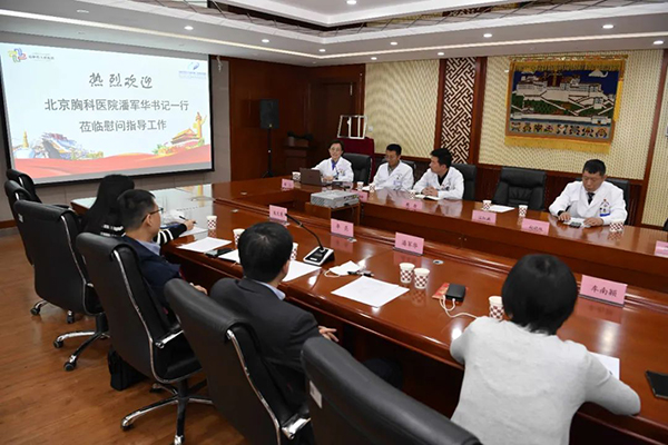 潘军华同志对拉萨市人民医院的精心安排表达感谢,代表医院党委亲切慰问穆晶同志,对其工作成效和收获表示了赞许,评价穆晶同志的汇报是“真心流露,情真意切”,在高原发挥优势、用心援助!叮嘱其做好援助工作的同时注意保重身体。他表示,对口援藏是一项重要政治任务,一批批援藏干部前赴后继开展援助工作,为西藏建设持续注入新活力、打开新局面。我院援藏干部要切实增强责任意识和担当精神,在艰苦繁重的援藏工作中敢于迎接挑战,主动深入基层,发挥自身优势,奋力攻坚克难,锤炼过硬本领,切实提升援藏工作深刻内涵,将胸科医院的先进技术、管理理念和胸科精神扎根西藏,为持续助力西藏医疗事业发展作出新的更大贡献。