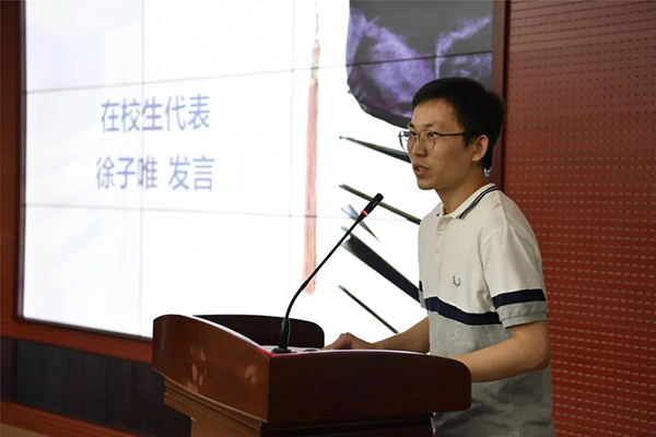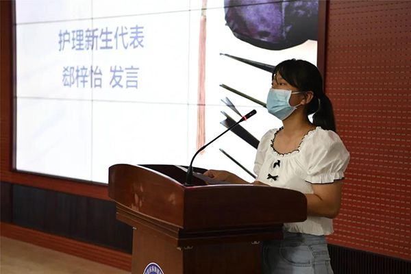 随后,2021级硕士研究生刘天慧代表新生发言,表示一定不忘初心,尊师重教,严于律己,将校训“扶伤济世、敬德修业”牢记于心,在老师们的指导下,奋发向上,努力实现自己的价值。2020级护理新生代表郄梓怡同学表达了要学习前辈们救死扶伤的精神,在接下来的时间里夯实基础,提升自己的专业技能,做一名合格的医务工作者。2020级硕士研究生徐子唯作为在校生代表发言,向新同学们分享了学习和生活经验,并希望大家能够坚定目标,不惧困难,以努力书写青春,用汗水浇灌梦想,创造出属于自己的成绩。