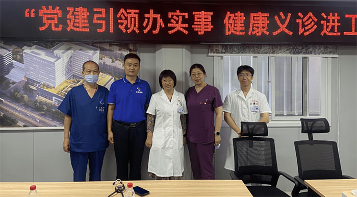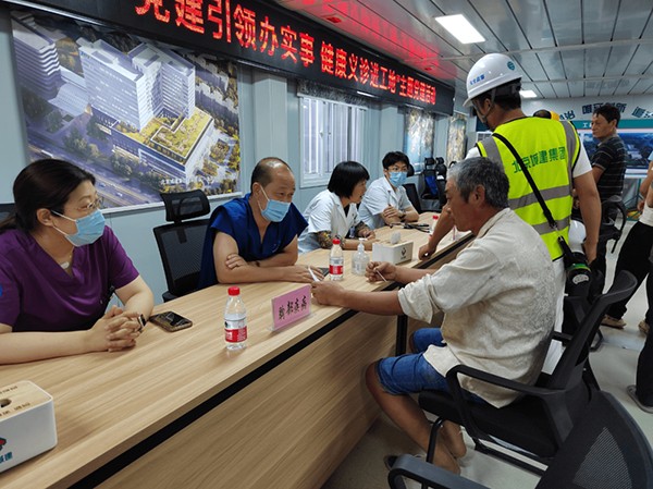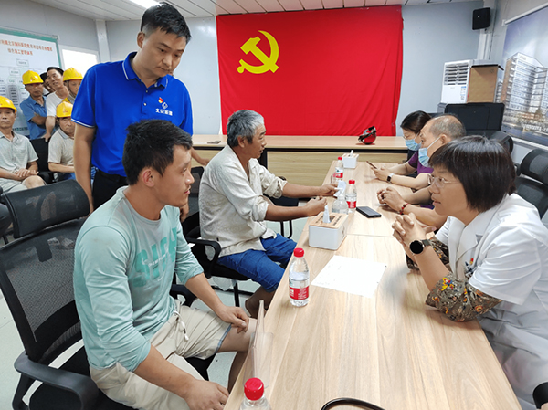 为深入学习贯彻党的二十大精神,用实际行动守护人民健康,2023年8月8日,北京胸科医院门急诊、呼吸、行政二党支部联合北京城建项目党支部在医院内项目工地办公区会议室开展“党建引领办实事,健康义诊进工地”党建活动,引导工人提高健康意识,形成健康的生活方式。