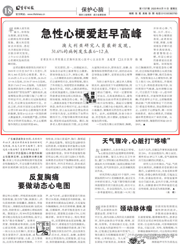 早高峰人流车流量大,容易发生拥堵,甚至车祸,心脏病也有早高峰现象。澳大利亚皇家北岸医院、悉尼大学悉尼医学院近日联合研究发现,上午6~12点是急性心肌梗死发病的高峰时段。