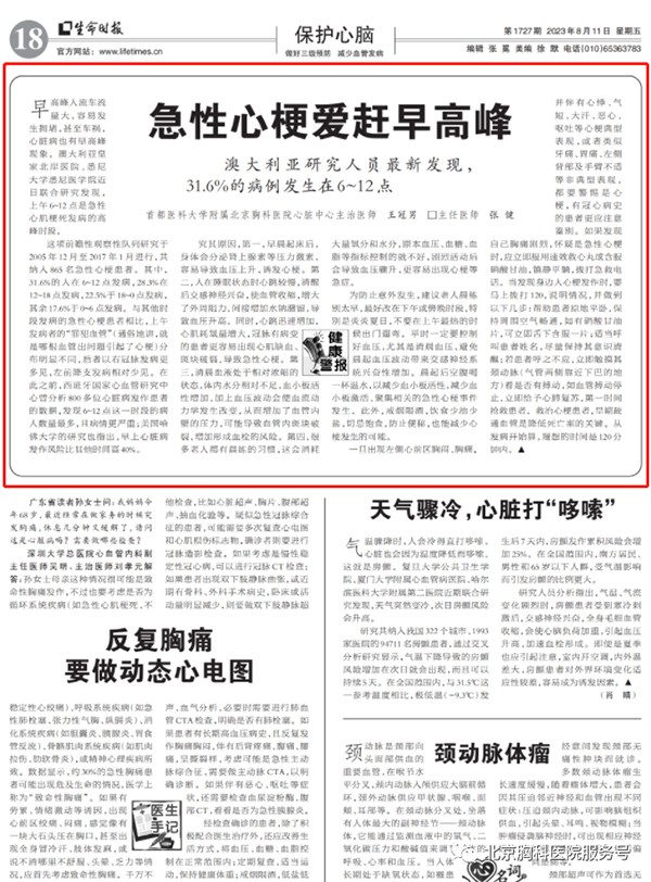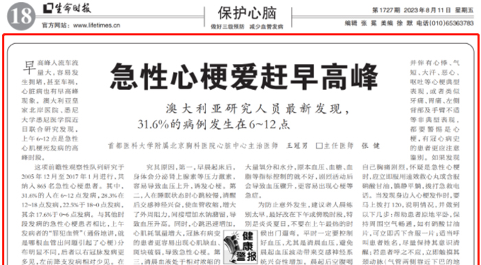 早高峰人流车流量大,容易发生拥堵,甚至车祸,心脏病也有早高峰现象。澳大利亚皇家北岸医院、悉尼大学悉尼医学院近日联合研究发现,上午6~12点是急性心肌梗死发病的高峰时段。