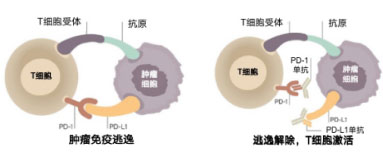 ▶PD-1与PD-L1结合后,T细胞发生失活,肿瘤避免被免疫系统清除