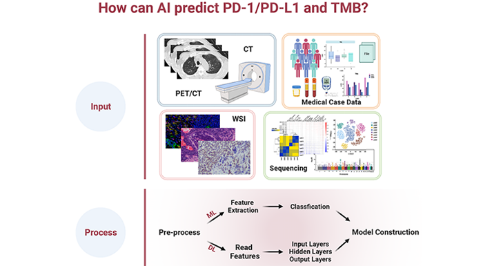 肺癌是中国及世界范围内最致命的癌症类型之一。目前,越来越多的肺癌患者已从免疫疗法中获益,精准识别免疫治疗获益人群并进行疗效预测已成为热点问题。近年来,基于机器学习的人工智能已经在医工融合领域迅猛发展,大量研究通过使用影像组学、病理组学、基因组学、蛋白组学等数据,通过建模预测癌症患者程序性死亡配体1(PD-L1)、肿瘤突变负荷(TMB)、肿瘤微环境(TME)等信息,进而预测患者免疫疗法的获益情况与副反应发生情况,证明了人工智能在未来作为“数字化活检”的应用潜力,有望造福更多癌症患者,助力临床决策。
