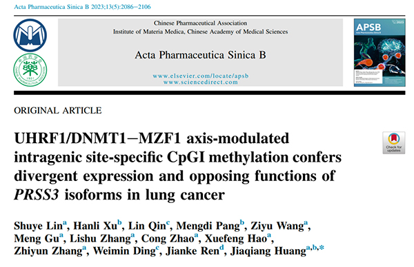 近日,首都医科大学附属北京胸科医院肿瘤研究中心林舒晔博士在《Acta Pharm Sin B》发表题为“UHRF1/DNMT1eMZF1 axis-modulated intragenic site-specific CpGI methylation confers divergent expression and opposing functions of PRSS3 isoforms in lung cancer”的研究论文。阐明了PRSS3多个剪接体差异在肺癌发生发展中的作用,为临床转化提供了实验依据。首都医科大学附属北京胸科医院林舒晔博士为第一作者,黄家强教授为通讯作者。
