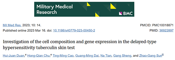 2023年3月,首都医科大学附属北京胸科医院转化研究室孙照刚研究员团队在Military Medical Research(Mil Med Res,IF=21.1)上发表文章:Investigation of the cell composition and gene expression in the delayed-type hypersensitivity tuberculin skin test。本研究中,利用scRNA-seq首次阐明了参与DTH的细胞及其转录组的异质性,表明了DTH反应过程中的免疫微环境。破译DTH中不同类型细胞及基因的反应性可以为TST试剂的改进提供有力的支撑。使用明确的蛋白成分作为理想的TST试剂是可能实现的,例如用EC代替成分复杂的PPD诊断结核病。首都医科大学附属北京胸科医院转化研究室研究生段惠娟和褚洪迁副研究员为共同第一作者,孙照刚教授为通讯作者。