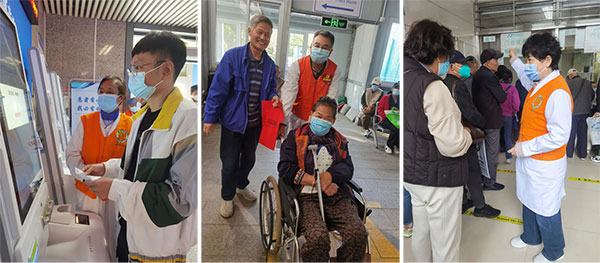 早上8点不到,志愿者们就来到了门诊自助机大厅、分诊台及收费大厅。他们身穿橘色志愿者马甲,佩戴党徽,虽然头发有些花白,但是他们精神饱满。此时的门诊里已经迎来“早高峰”,面对患者提出的各种疑问,他们熟练地为患者及群众提供就医引导、医疗咨询、健康保健、政策宣传等各项服务。
